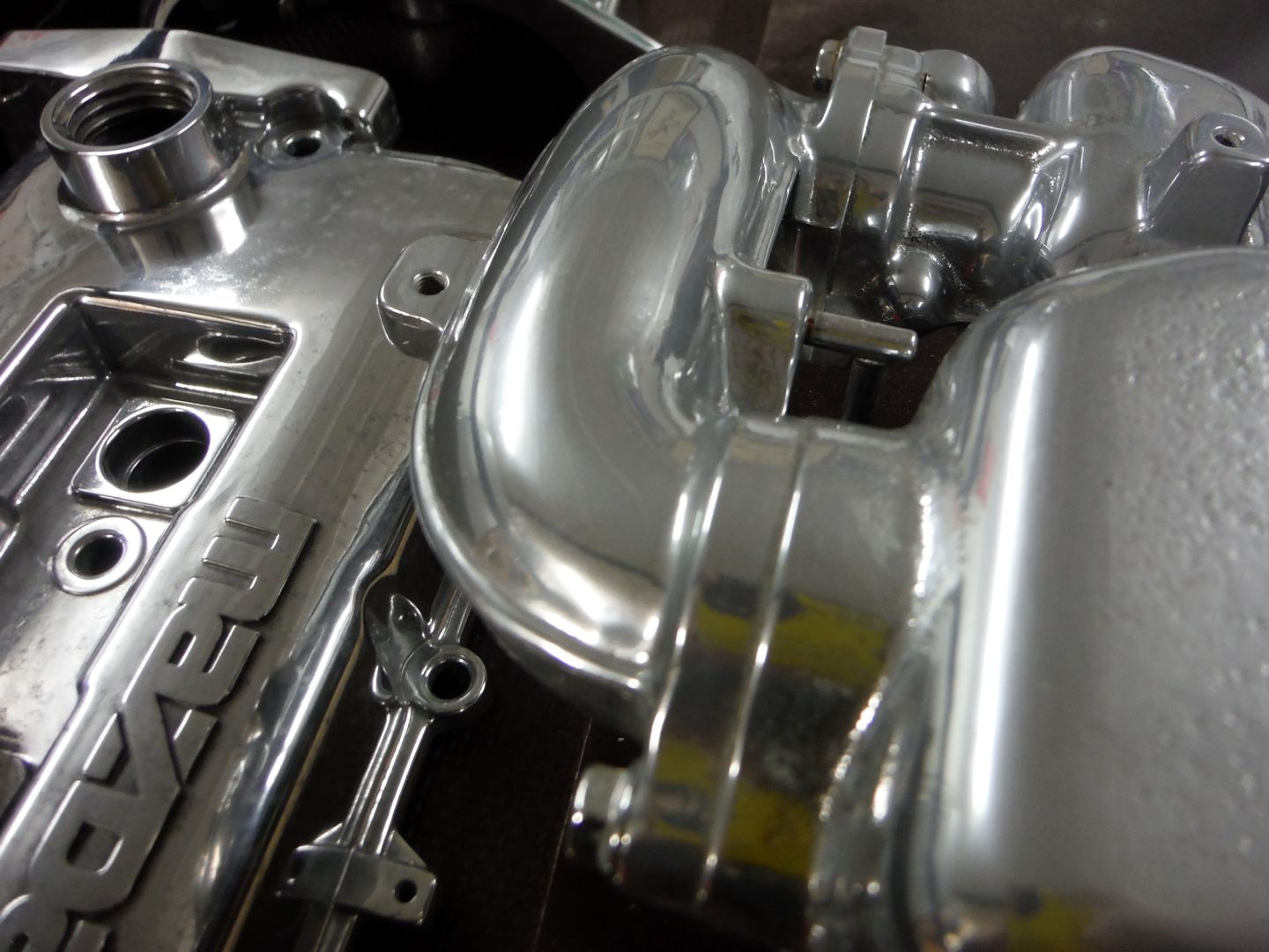 da muss ich mal kurz das technische Vorgehen erklären. Die Maschine auf der das gemacht wird ist hautsächlich für Felgen. Die wird einfach mittig festgeschraubt und dann rotiert ein Behälter. Im Behälter ist ein Emulsion und Keramikkegelchen. Es gibt drei Behälter mit unterschiedlich großen Keramikteilchen. Für die ASB habe ich also erst eine Stahlplatte angepasst damit überhaut eine mittige Befestigung möglich ist, die Wanne reicht für Felgen bis ca. 20", es wird eng. Die ASB darf nicht mit rotieren oder schwingen, das macht die Wanne. Damit die Partikel überhaupt durch die ASB wandern habe ich Löcher im Bereich der Ansaugkanäle gemacht, das ging nur mit einem Plasmaschneider.(Bilder der Platte reiche ich nach) Der Durchfluss bzw. Kontakt der Keramikpartikel mit der Außenseite ist größer als mit der Innenseite das erklärt der Glanzunterschied. Bei den Deckeln ist die Befestigung ganz einfach, durch das Loch des mittleren Kerzensteckers. Die Aluminiumlegierung ist auch nicht ganz so ideal, der Magnesiumanteil scheint recht hoch zu sein aber auch nicht gut durchmischt, das gibt zum Teil einen Marmoreffekt. Nur außen ist sich möglich, da must du die Eingänge verschließen, nur innen wird schwierig. LittelSix |