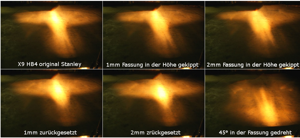 Im direkten Vergleich mit neunen Halogenscheinwerfern kommt der X9 mit sauberen Scheinwerfern noch immer sehr gut mit. Das Halogen bei weitem nicht mit einem gut konstruierten Xenonscheinwerfer mithalten kann sollte nach den Bildern eindeutig sein. Da kommt auch eine +90% oder 100W Halogenlampe nicht mit. (Vor kurzem laß ich hier gerade gegenteiliges) Was bringt es mir, einen hellen Spot vor mir zu haben, aber rundherum ist es düster? Die richtige Lichtverteilung macht es, und die ist von der Scheinwerfergeometrie abhängig. Das Xenon bringt punktuell nicht mehr an Helligkeit auf die Straße sondern verteilt sein knapp 3x mehr an Licht bei gleichbleibender höchster Helligkeit vergleichbar mit dem hellsten Fleck des Halogens breiter auf die Fahrbahn. Xenon in sauberen Projektions-Halogenscheinwerfern ist insofern kein Problem, da diese Gasentladungslapen einen kleineren Lichtentstehungsort besitzen als die Halogenwendel und die Scheinwerfergeometrie somit passt. Wie sich die Temperatur im gleichen Schweinwerfergehäuse bei Halogen oder Xenon verhält konnte ich aufgrund Zeitmangels noch nicht mit der Wärmebildkamera überprüfen. -> Überlegungen unbedacht LWR und Waschanlage, TÜV und Versicherung! Zur Hilfestellung damit man mir leichter erklären kann wie man folgende Fehlstellungen des Leuchtmittels mit Hilfe der Scheinwerfereinstellung beheben kann: ;-) Anhang 3765 Man bedenke auch daß hier das Licht auf 5m Länge verteilt ist, im normalen Fall von 50m Leuchtweiteneinstellung sich die hellen Spots durch die weitere Entfernung relativieren und ohne den hellen Spot am richtigen Fleck ...möglicherweise :-)... kaum mehr Licht in der Ferne ankommt ... aber ich irre mich bestimmt und bitte daher um zurechtweisung. :mrgreen: So, genug mit meiner Märchenerzählerei Hatschi |