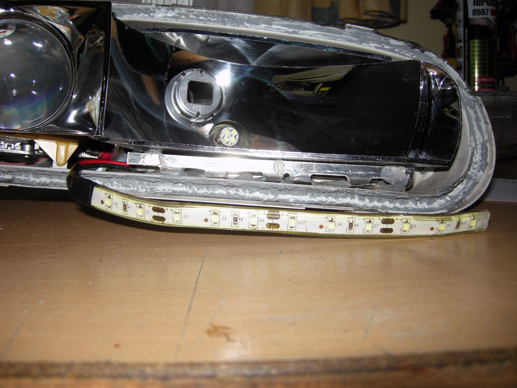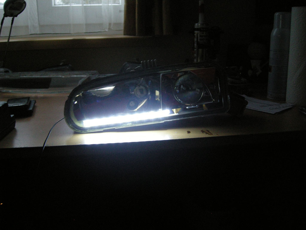 Da ich die SW schon geöffnet hatte, habe ich mir nicht die Gelegenheit nehmen lassen, eine LED-Tagfahrlich Leiste einzubauen. Materialaufstellung: 2x SMD-LED Leiste 2x Pluskabel (rot 1mm²) ca 25cm 2x Massekabel (schwarz 1mm²) ca 25cm 1x Winkelleiste 30cm Heißklebepistole dünner Draht Seitenschneider/Abisolierzange Schrumpfschlauch/Isolierband Kabelschuhe Schritt 1. Nachdem die SW geöffnet waren, habe ich mir von der Winkelleiste ein Stück mit 15cm abgeschnitten, entgratet und per Heißkleber eingeklebt. Jeweils ein Plus und Massekabel an die LED-Leiste gelötet, Schrumpfschlauch (oder Isolierband) drüber und die Kabelschuhe am anderen Ende aufgepresst. Das Standlichtkabel habe ich durchtrennt und jeweils die Enden mit den richtigen Kabelschuhen versehen. Somit kann ich z.B fürn TÜV/Pickerl etc einfach die Kabel umstecken und gut ist... Und da die LED-Leiste einen weißen Hintergrund aufweißt, fallt diese nicht einmal auf :-D (der Pickerltyp vom ÖAMTC hats nicht mal gemerkt, obwohl er die SW kontrolliert hat und direkt davor Stand) Anhang 7173 Standlicht Anhang 7174 LED-Leiste Anhang 7175 Schritt 2. Dann habe ich mir kurze Drahtstücke abgezwickt und mit diesen die LED-Leiste an der Winkelleiste befestigt. Anhang 7176 Anhang 7177 Schritt 3. Probelauf der LED-Leiste Anhang 7178 Resumé Anhang 7179 Jetzt muss ich mir nur noch farblich angepasste Fern-/Ablend- und Neblerbirndln kaufen (weißes Licht gefällt mir sowieso besser) |
