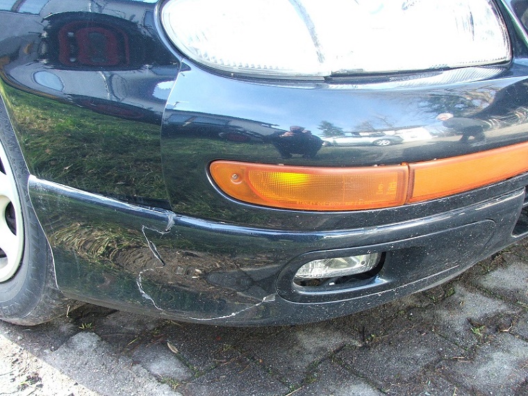 - Die Stoßstange ist vorne rechts beschädigt (gebrochen).