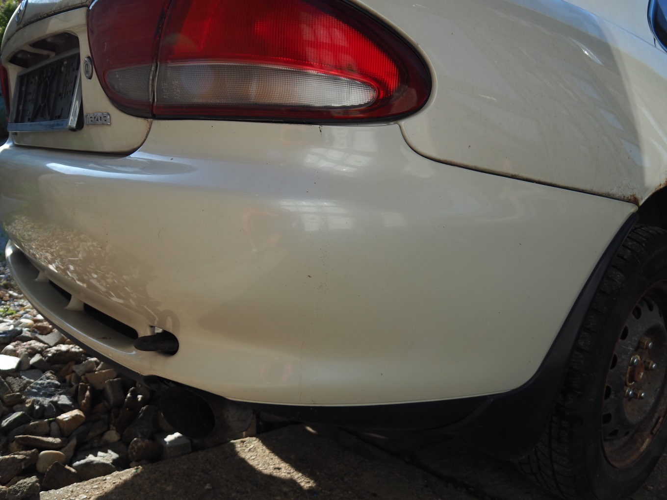 Auch vordere und hintere Stoßstange erscheinen in, für das Alter und die Laufleistung, überdurchschnittlich gutem Zustand. Die Original-Alus haben Sommerreifen, derzeit steht das Auto auf Stahlfelgen mit Winterreifen. Die Reifen sind allerdings aufgrund des Alters natürlich nicht mehr für den Straßengebrauch geeignet. Immerhin halten sie aber den Luftdruck. Der Vorbesitzer dürfte auch ein Antriebswellengelenk getauscht haben, da ich eine entsprechende Schachtel samt Altteil im Kofferraum gefunden habe. Das ist jedoch nur eine Vermutung.