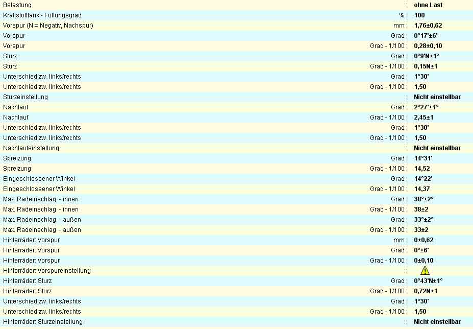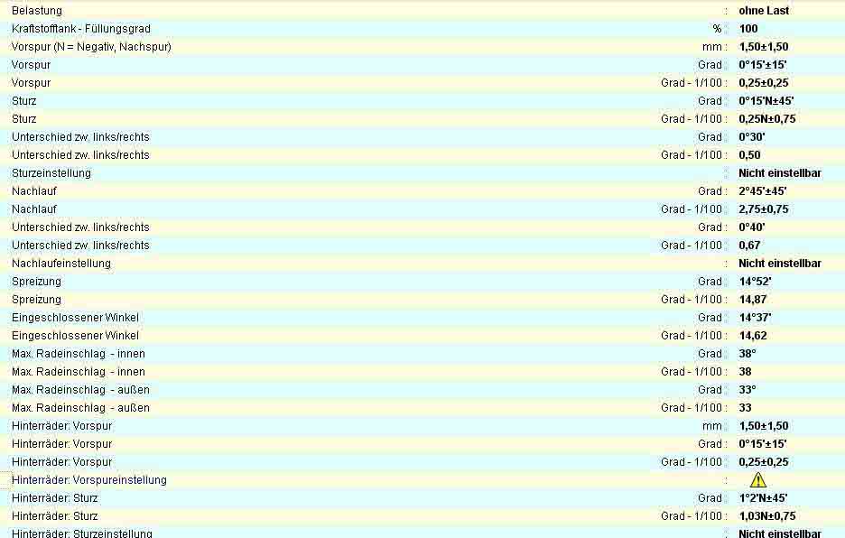 Auch wenn dort steht, dass der Sturz und Nachlauf an der Vorderachse nicht einstellbar ist muss ich sagen es geht, ist halt etwas umständlich, da dafür die Feder soweit gespannt werden muss, dass sich der Teller unter dem Domlager drehen lässt.Irgendwo im Forum müssten auch bilder davon sein.