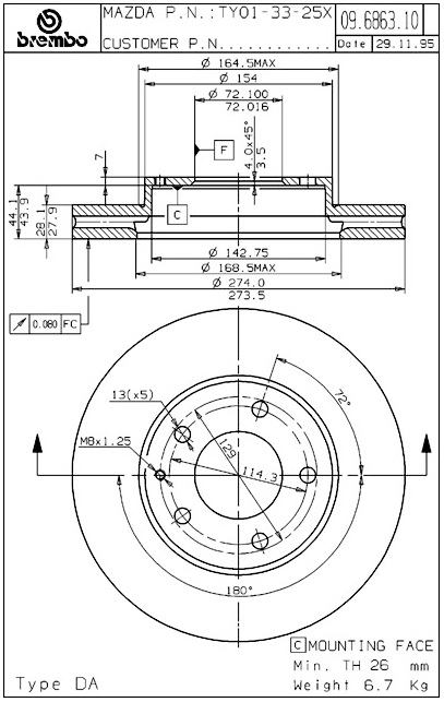 allmazda.net gibt auch alternative Hersteller und deren Bezeichnung für kompatible Teile an. Brembo ist im konkreten Fall zwar leider nicht dabei, aber es gibt in der Aufzählung z.B. ein Bild von BOSCH. Die BOSCH Bremsscheibe hat danach einen Durchmesser von 273.5 mm.