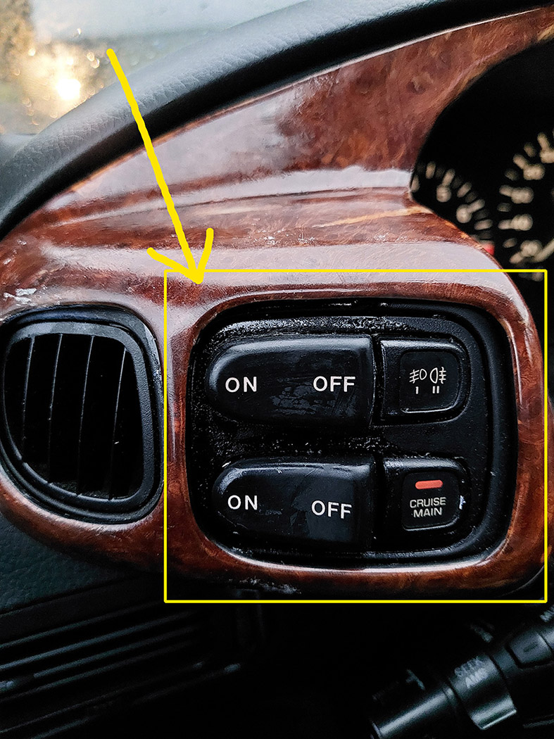 Gestern wollte ich schnell die Holzoptik-Verschalung des Armaturenbretts mit Sekundenkleber kleben. Die hatte sich wegen starker Hitze halb gelöst und hing (links) lose.