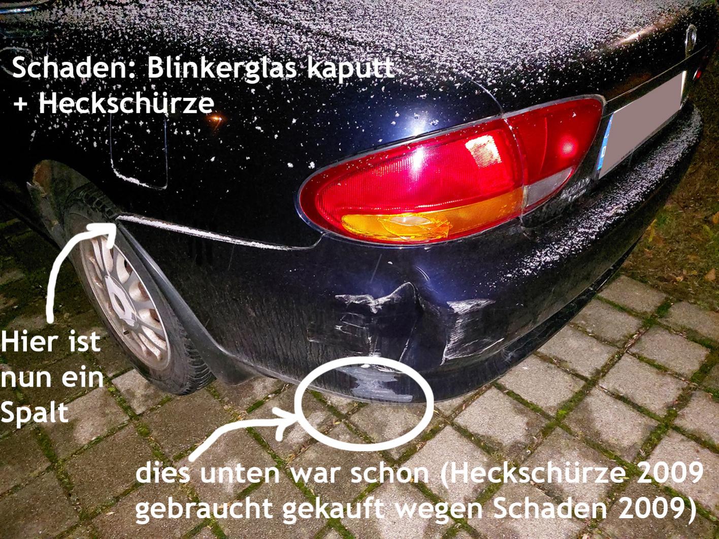 Heckschürze hat einen tiefen Dellen (siehe Fotos) und nur das orangene Blinkerglas (Xedos 6 Bj 1997) hats erwischt. Blinker geht noch. Hinter dem orangenen Plastik ist nochmal ein transparentes Plastik, d.h. die Birne selber ist also anscheinend dadurch noch geschützt. Habs jetzt mit Tesa außen dennoch etwas übergeklebt.