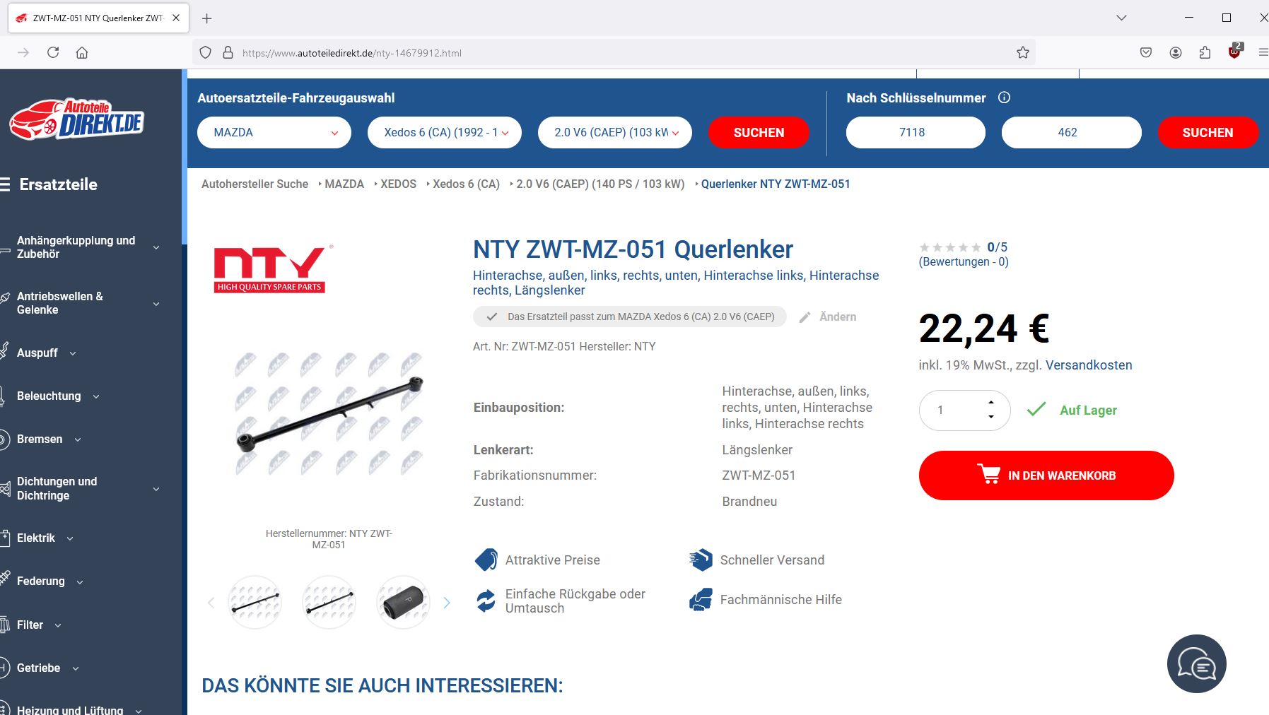 heute hat mein Xedos6 (V6, EZ 1997, 192t km) leider keinen TÜV bekommen. Vieles ist noch gut. Es hapert jetzt aber an poröser Zugstrebe, Hinterachse (längs). Die eine ist jetzt fällig, die andere auch bald. Ich brauche also beide (2 verschiedene laut dem Mechaniker).