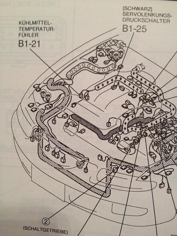 Der Kühlmitteltemperaturgeber (laut Plan der rechte der beiden beieinander liegenden Stecker, von vorne gesehen) führt zur Temperaturanzeige im Kombiinstrument, dürfte für Dein Problem also uninteressant sein.