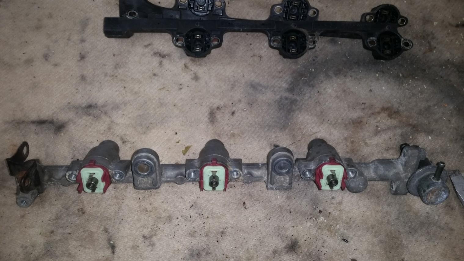 Die Leisten schauen übrigens sehr ähnlich aus, wie die vom KF & KL. Allerdings haben die Einspritzventile oben einen blauen Kunststoff-Teil, im Gegensatz zu deinen in Rot. Daher gehe ich davon aus, dass deinen einen höheren Durchflußwert haben als meine (ist aber für dein Problem jetzt irrelevant).