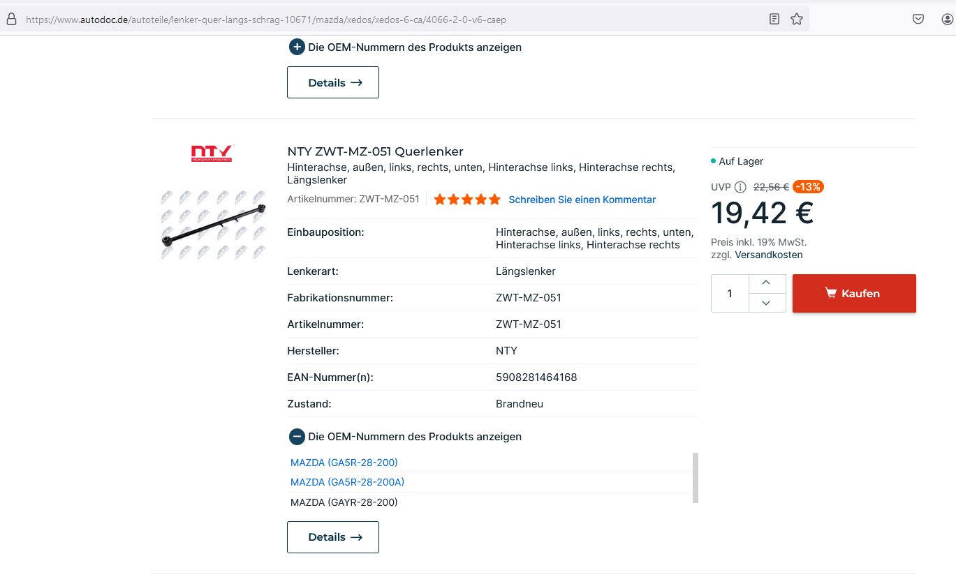 heute hat mein Xedos6 (V6, EZ 1997, 192t km) leider keinen TÜV bekommen. Vieles ist noch gut. Es hapert jetzt aber an poröser Zugstrebe, Hinterachse (längs). Die eine ist jetzt fällig, die andere auch bald. Ich brauche also beide (2 verschiedene laut dem Mechaniker).
