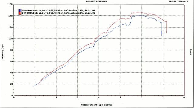Die begefügten Leistungskurven zeigen den Effekt dieser Manipulation. Das Gemisch paßt auch nachher noch ziemlich gut. Allenfalls im unteren und mittleren Bereich kann man ein wenig anfetten. Das habe ich bei mir gemacht und so dem Drehmoment noch ein wenig auf die Sprünge geholfen.