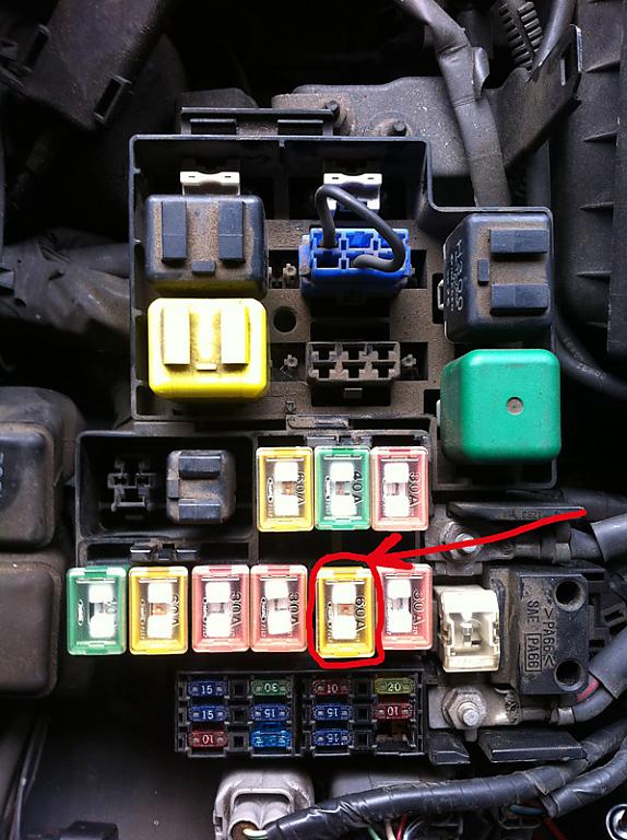 Dann die einzelnen Sicherungen im Sicherungskasten Motorraum rausgezogen. Als ich die 60A herauszog ging der Motor aus und im Armaturenbrett sind auch alle Lichter aus. (siehe Anhang Bild)