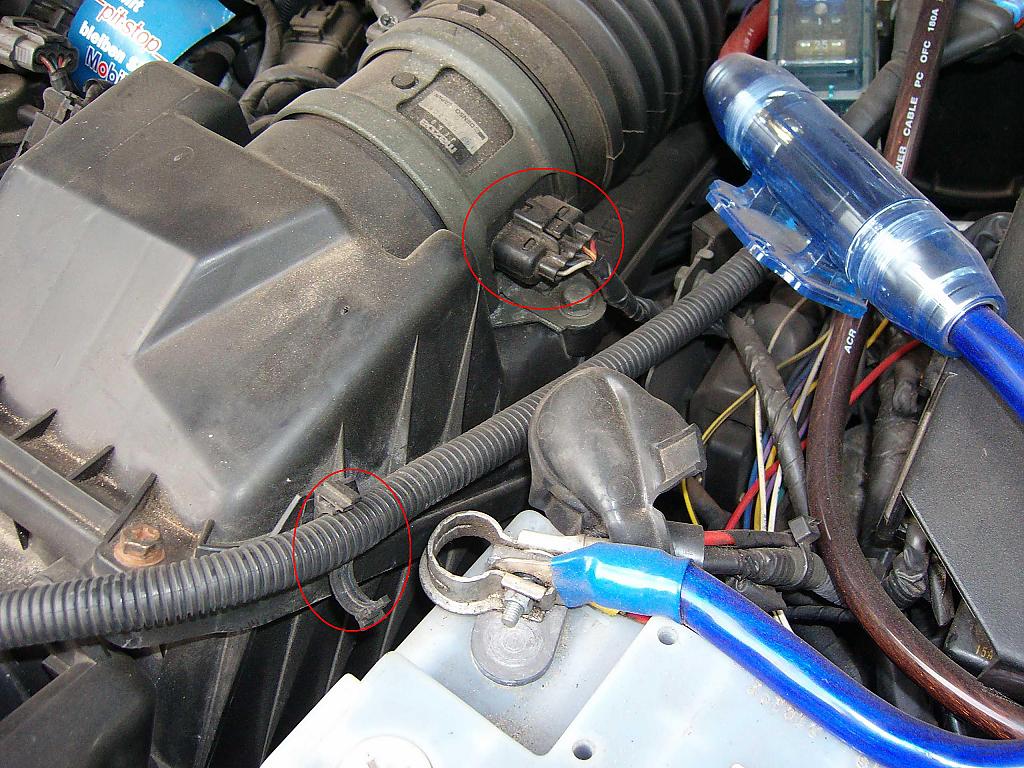 Als erstes müssen die kabel, die links am Luftfilter angeschraubt sind weg. Auserdem den Anschluß Vom Luftmassenmesser(?) auf der Rechten Seite(siehe Bild 1+2). Ausserdem ist auf der linken Seite noch ein kleiner Schlauch, diesen ebenfalls abziehen (Bild 3).