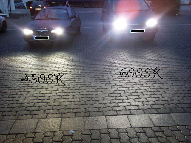 4300K ist mitnichten die Farbe von Halogen, denn es gibt nur sehr wenige Halogen-Lampen, die mit echten 4300K angegeben sind. Und selbst die wenigen, die angeblich 4300K haben, sind immer noch gelblich und nicht weiß. Ich habe Xenon-Brenner mit 4300K im Benz drin und die sind rein-weiß ohne nur den Hauch von gelblichem Stich. Ich habe noch keine Halogenlampen gesehen, die mit 4300K so rein weiß wären, wie die Xenon-Brenner in meinem Benz. Auch die mit 4300K angegebenen H1-Lampen im X6 sind deutlich gelblicher.
