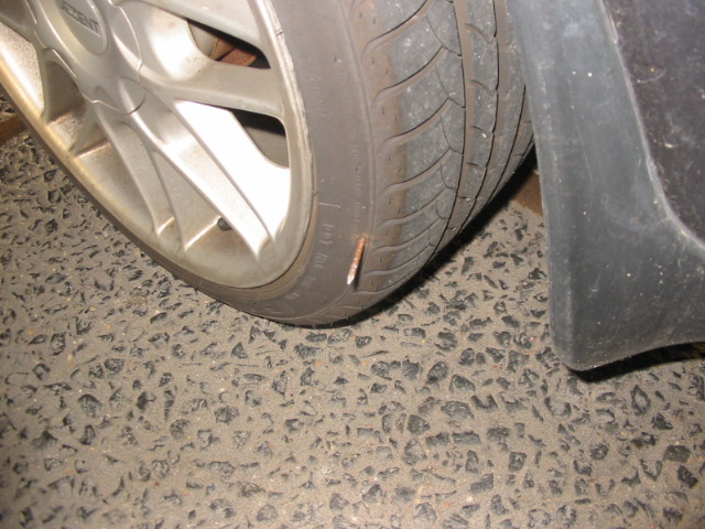 Ich frage mich bis heute wie das gegangen ist, da müsste die Schraube ja dort gestanden sein oder schräg in der Luft geschwebt, damit das Teil sich genau senkrecht reinbohrt. Und dann bleibt noch die Frage, wie kann die Schraube einfach stehenbleiben, die müsste doch umfallen sobald sie vom Reifen berührt wird....