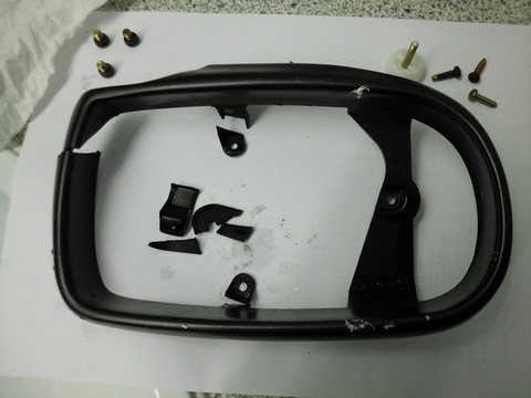 ..gehe ich nach Kenntnis des Innenlebens davon aus, dass mit an Sicherheit grenzender Wahrscheinlichkeit ein bis zwei der drei Halterungen des Rahmens abgebrochen sind. Dabei muss der Rahmen nicht gleich so drastisch und eindeutig zerbrochen sein, wie hier gezeigt. Auch bei meinem äußerlich unversehrten Spenderspiegel war eine Halterung abgebrochen. Ich hatte noch einen dritten Rahmen und auch dort ist dann eine Halterung erst bei vorsichtiger Montage abgebrochen, die war offenbar auch schon vorgeschädigt.