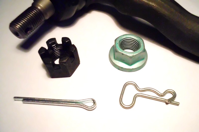 Also ich würde denken die rechts abgebildete Mutter gehört nicht zu diesem Spurstangenkopf. Heutzutage kommen da meist selbstsichernde Muttern oder eben diese Kronenmuttern mit Splint zum Einsatz. Dieser komische Splint gehört schon gleich garnicht zu dem Teil. Damit kann man Bolzen gegen rausfallen schützen, wie beispielsweise bei KFZ-Unterstellböcken.