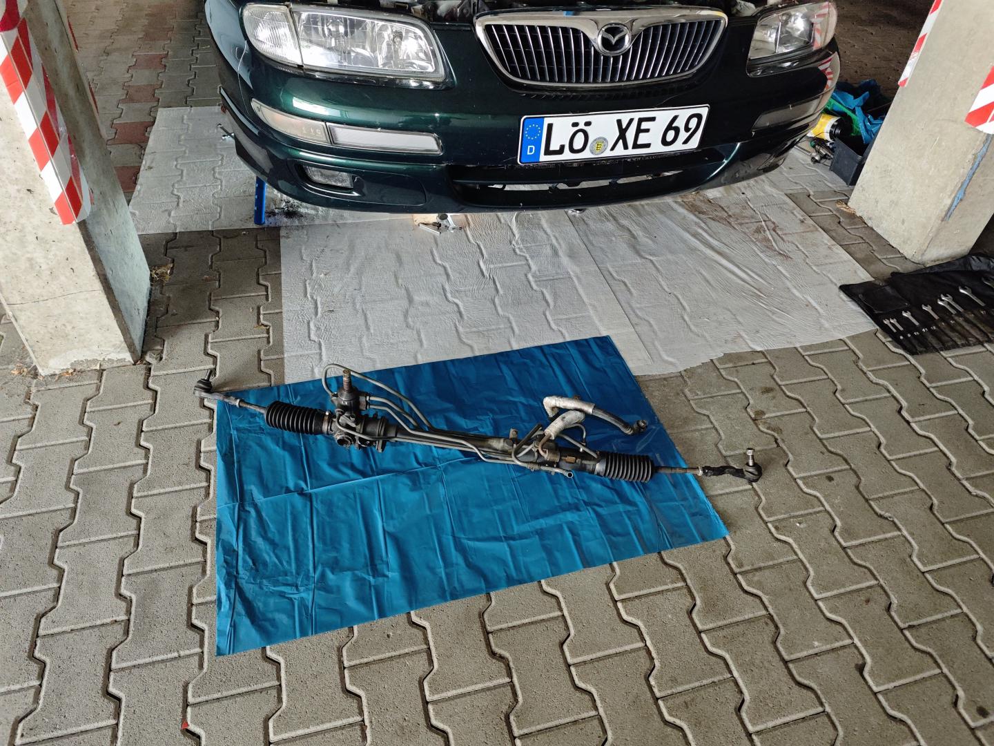 Wenn ich es richtig in Erinnerung habe, ist das Lenkgetriebe auf den VA-Träger von oben drauf verschraubt.