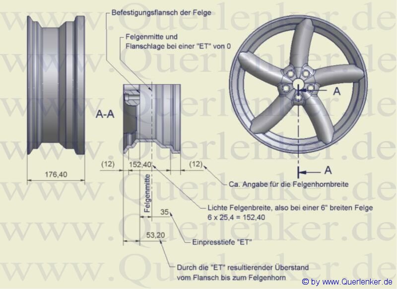 die ET bestimmt, wie weit die Felge in das Radhaus steht. je kleiner die ET, um so weiter steht sie nach außen. Die Et berechnet sich nach der Felgenmitte.