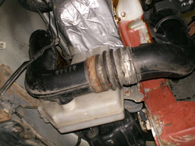 Die Modifikation dieses Rohres besteht darin, sein oberes Ende, die Rückführung in den Motorraum, mit einer Säge anzuschneiden, damit jetzt die Luft aus dem kühlen Radkasten angesaugt wird. Damit die Luft kühl bleibt, wurden sämtliche Öffnungen und Durchbrüche zum Motorraum zugeklebt.