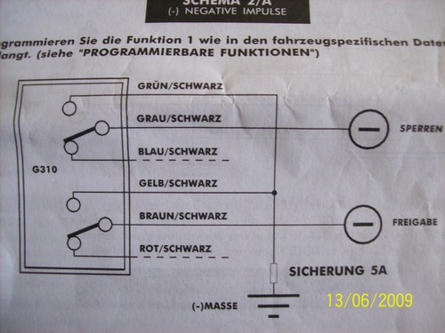 Aber etwas einfacher beschrieben: grün-schwarz und gelb-schwarz verbindest Du fest mit schwarz und dieses mit Masse (oder dem Masse-Kabel am ZV-Relais). Braun-schwarz und grau-schwarz verbindest Du jeweils mit je einem der dünnen Steuerkabel (auf / zu) am ZV-Relais.