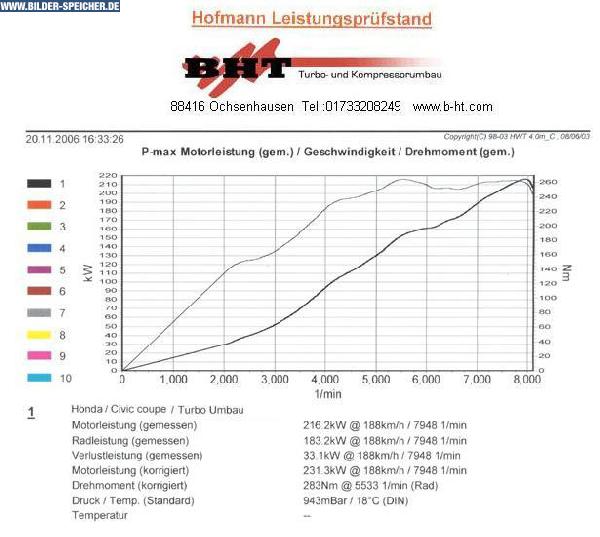 Nur zum Vergleichen, die Leistungskurve des Turbo-Civics meines Brüderleins. 1,8 VTEC (Sprung der Leistung ab 6 kU/min). Turbo setzt bei 2,5-3 kU/min. Ladedruck liegt bei 0,6-0,8 Bar. Der originale 1,8er hatte 165PS. Beachte bitte das Drehmoment. Die paar PS Mehrleistung sind dagegen "Grundrauschen".
