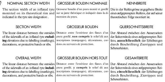 "Section Width" und "Overall Width" sind noch einmal im folgenden Bild erklärt (damit ist auch erklärt, dass sich bei einem Reifen, den es ohne und mit FSL gibt, an der Section Width und schon garnicht der Nominal Section Width irgendetwas ändert):