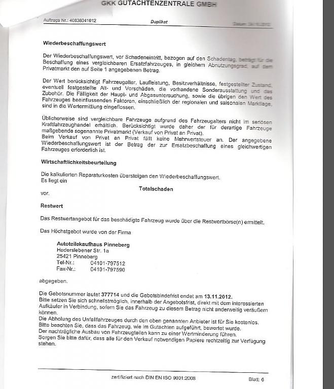 jedenfalls ist es (zumindest in Ö - ich spreche aus erfahrung...) so, dass beim wirtschaftlichen totalschaden vom wiederbeschaffungswert der (aufgrund des gebots festgestellte) restwert abzuziehen ist. dieser betrag wird dir von der versicherung angeboten - nimmst du das an, dann darfst du das fahrzeug behalten. nimmst du das nicht an, dann erhältst du den vollen wiederbeschaffungswert. (korrekt müsste man eigentlich sagen, dass die versicherung den wiederbeschaffungswert bezahlt und du ein vorkaufsrecht hast, wenn du bereit bist das gleiche zu zahlen wie das höchste gebot - unterm strich machts aber keinen unterschied zu dem vorhin beschriebenen...