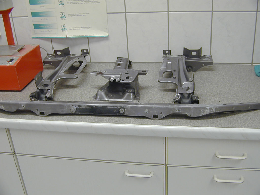 Das Schlossträgerblech musste ich zerlegen, zuviel Dreck und Rost zwischen den Blechen. Jetzt kann der Lacker das besser machen.