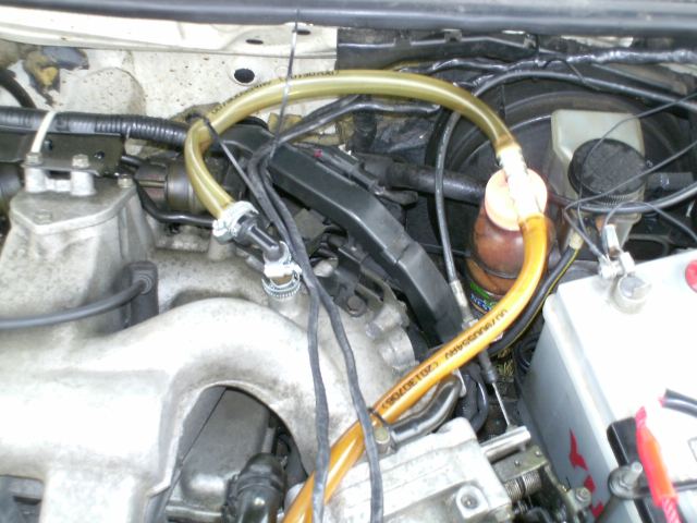 Damit mein neues Ventil nicht wieder mit Rückständen zuklebt, habe ich einen Olabscheider dazwischen gesetzt. Er war in seinem ersten Leben eine Getränkeflasche, die ich mit Schaumstoff gefüllt habe. Diese Flasche hat unten einen Kondenswasserablauf. Man sollte sich nicht wundern, was da für Wasser aus dem Öl kommt. Darum sitzt das eigentliche PCV-Ventil bei mit nun unmittelbar am Stutzen des Ansaugkrümmers.