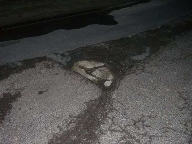 Das dazu gehörige Loch in der Starße war schnell gefunden. mind. 10cm tief und richtig schön scharfkantig. Und im Dunkeln natürlich kaum zu sehen.