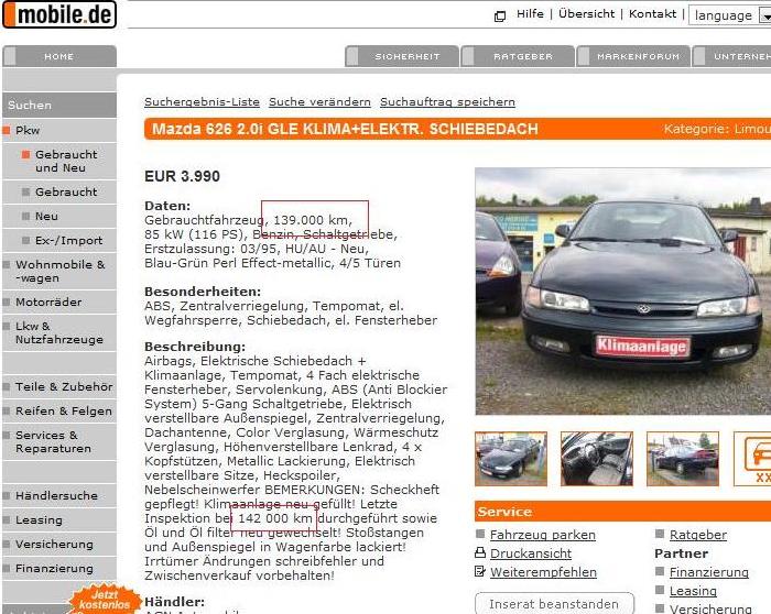 Weiters haben wir beim Kauf unseres Premacy bei Mazda (also bei Mazda Werkstatt uinseres Vertrauens) angefragt, die haben eine Datenbank über Garantiefälle und Mobilitätsservice, da wird immer der km Stand eingetragen, auch daraus kann man auf die tatsächlichen km rückschließen. Unser Premacy hatte z.B. ca. 6 Monate vorher zufällig das Mobilitätsservice gerufen und in der Mazda Werkstatt waren ca. 7000 km weniger als aktuell eingetragen worden, was also genau für ein halbes Jahr passt...