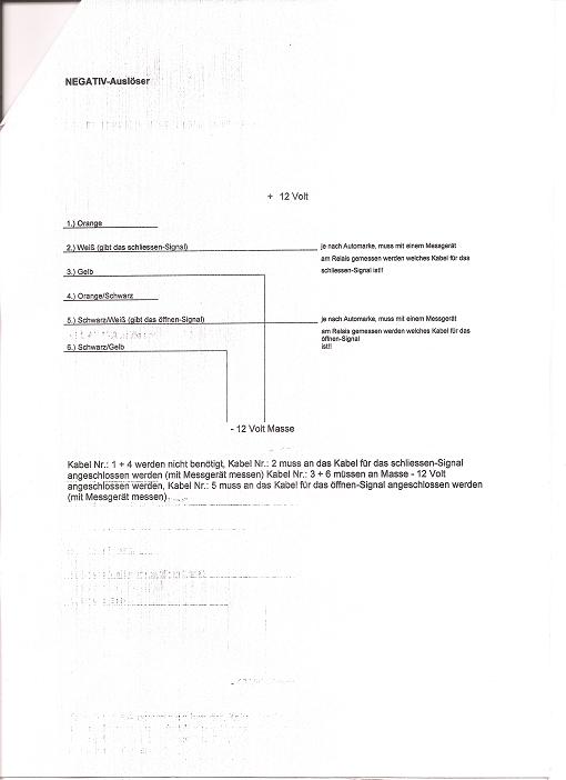 Hier ist ja sogar mal die Anleitung passend und korrekt: gelb und schwarz/gelb ziehst Du auf Masse, weiß und schwarz/weiß verbindest Du mit je einem der beiden Kabel, die für die Öffnen- und Schließ-Signale am ZV-Relais zuständig sind. Fertig. Gegebenenfalls sind dann Öffnen und Schließen vertauscht, dann musst Du das weiße und das schwarz/weiße Kabel vertauschen. Orange und orange/schwarz dürfen nirgends angeklemmt werden (abisolieren).